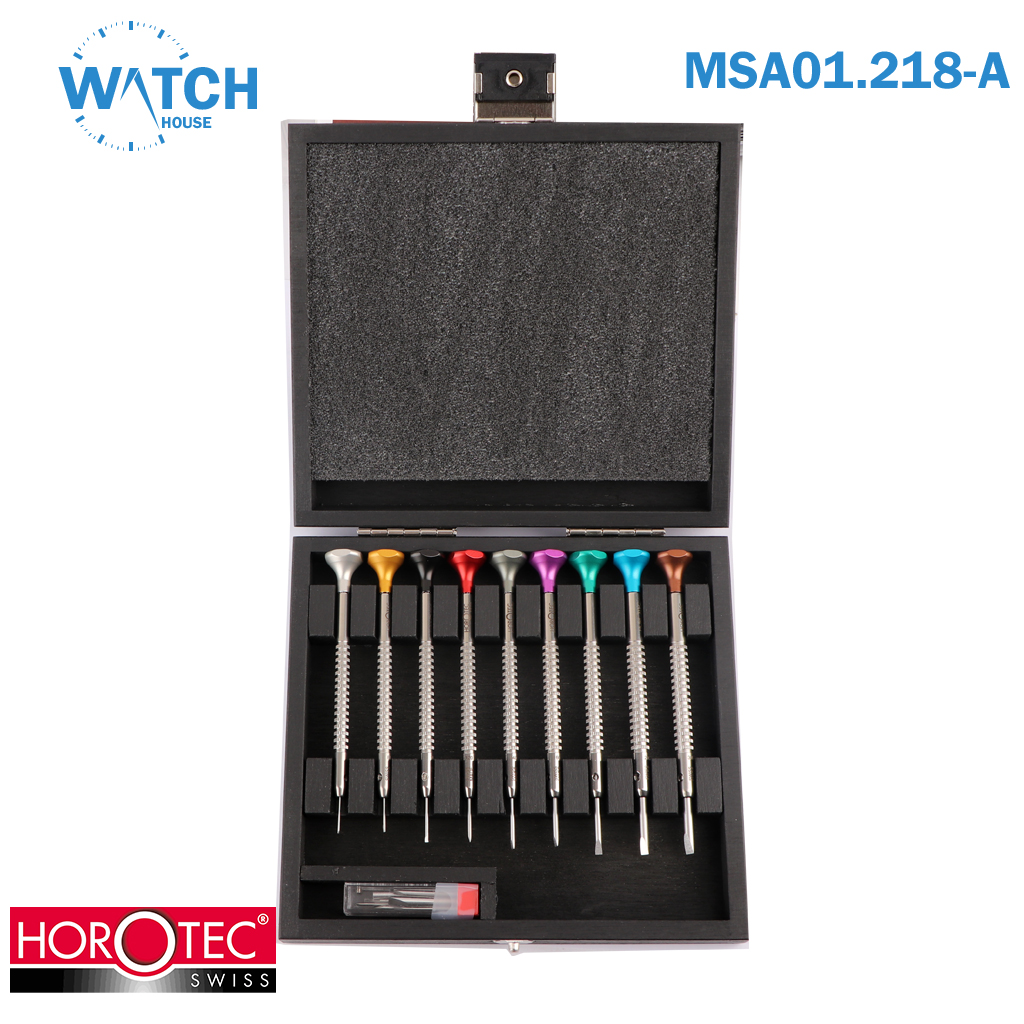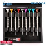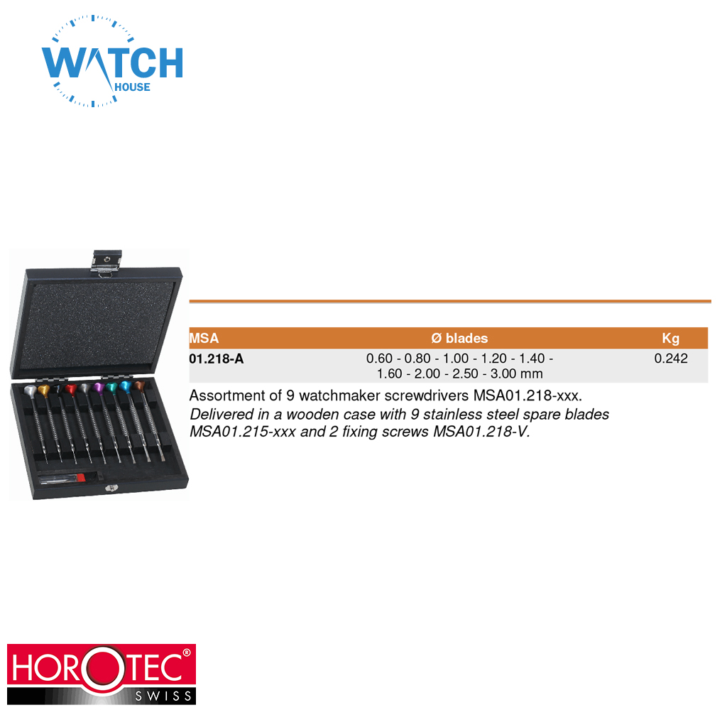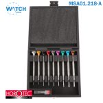 مجموعة من مفكات صناعة الساعات في علبة خشبية MSA01.218-A ، 9 قطع + 9 شفرات MSA01.215-x + 2 مسامير MSA01.218-V