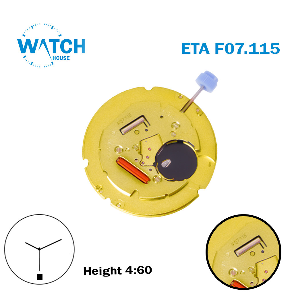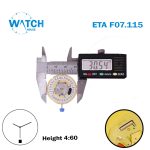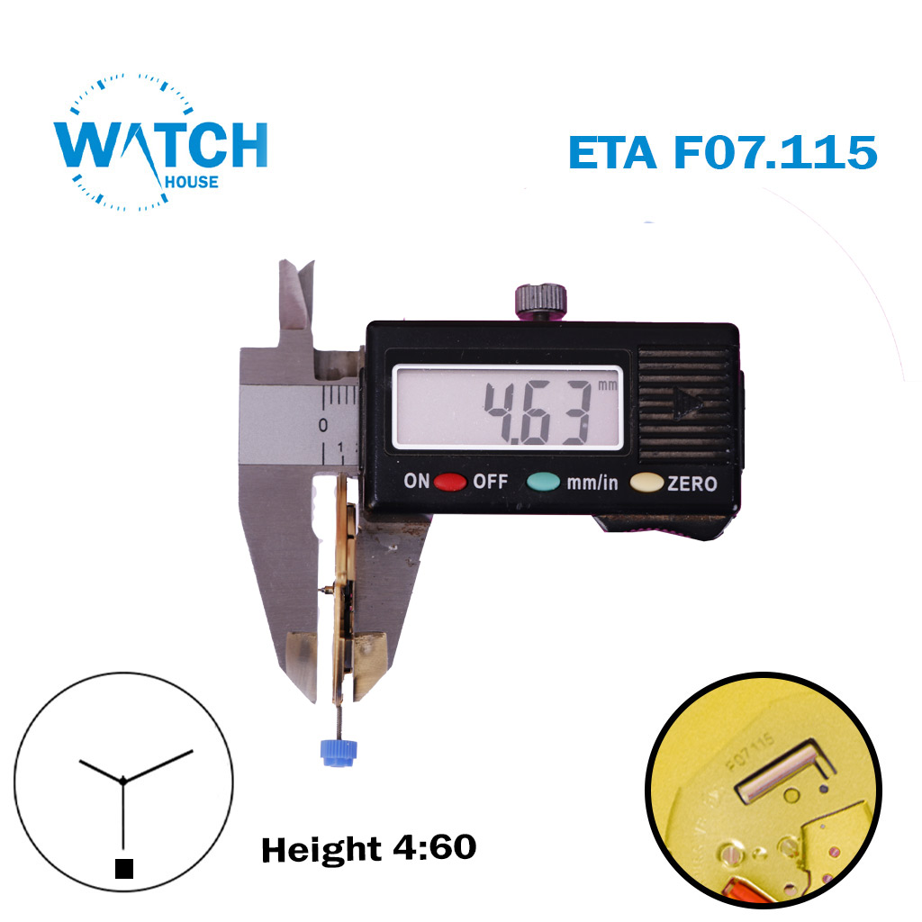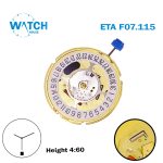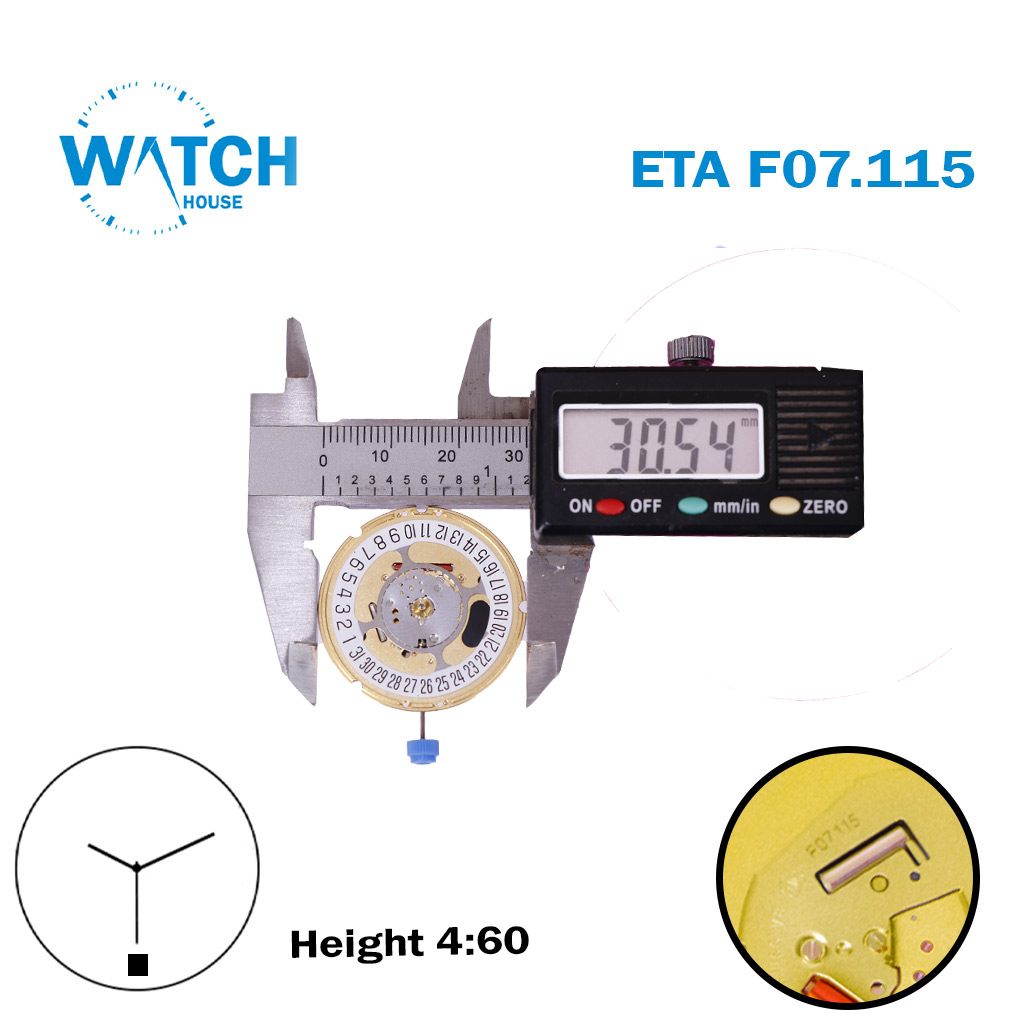 حركة ساعة ETA F07.115 سويسرية الصنع، قرص التاريخ الأبيض عند 6، الارتفاع 4.60 ملم.