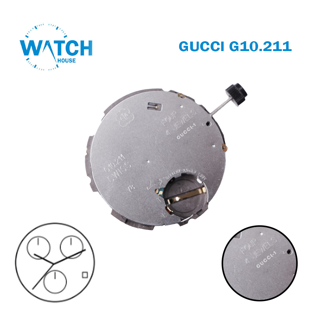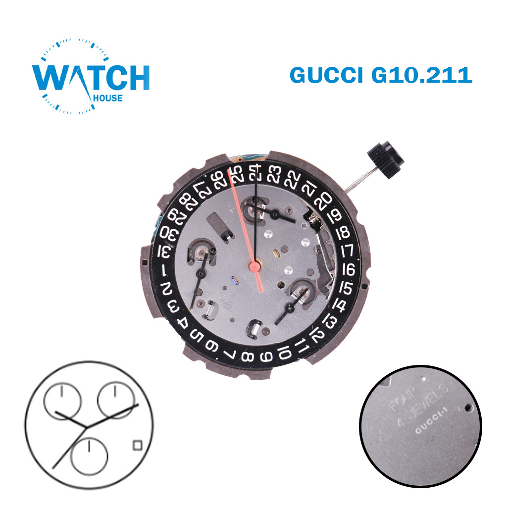 حركة ساعة ETA G10.211 (Gucci) سويسرية الصنع، قرص تاريخ أسود عند 4، 4 جواهر.