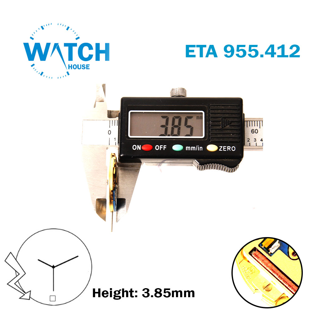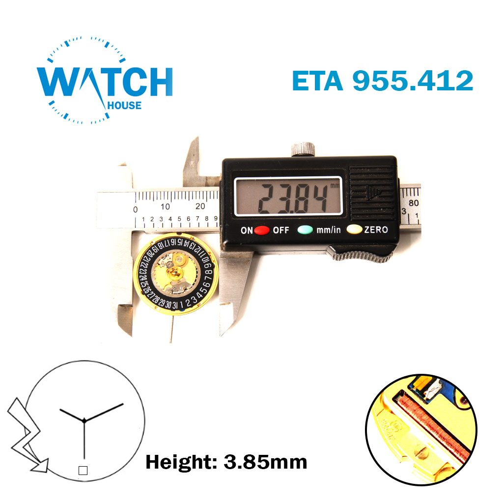 حركة كوارتز سويسرية الصنع ETA 955.412، قرص تاريخ أسود عند الساعة 6، 3 عقارب، ارتفاع 3.85 مم