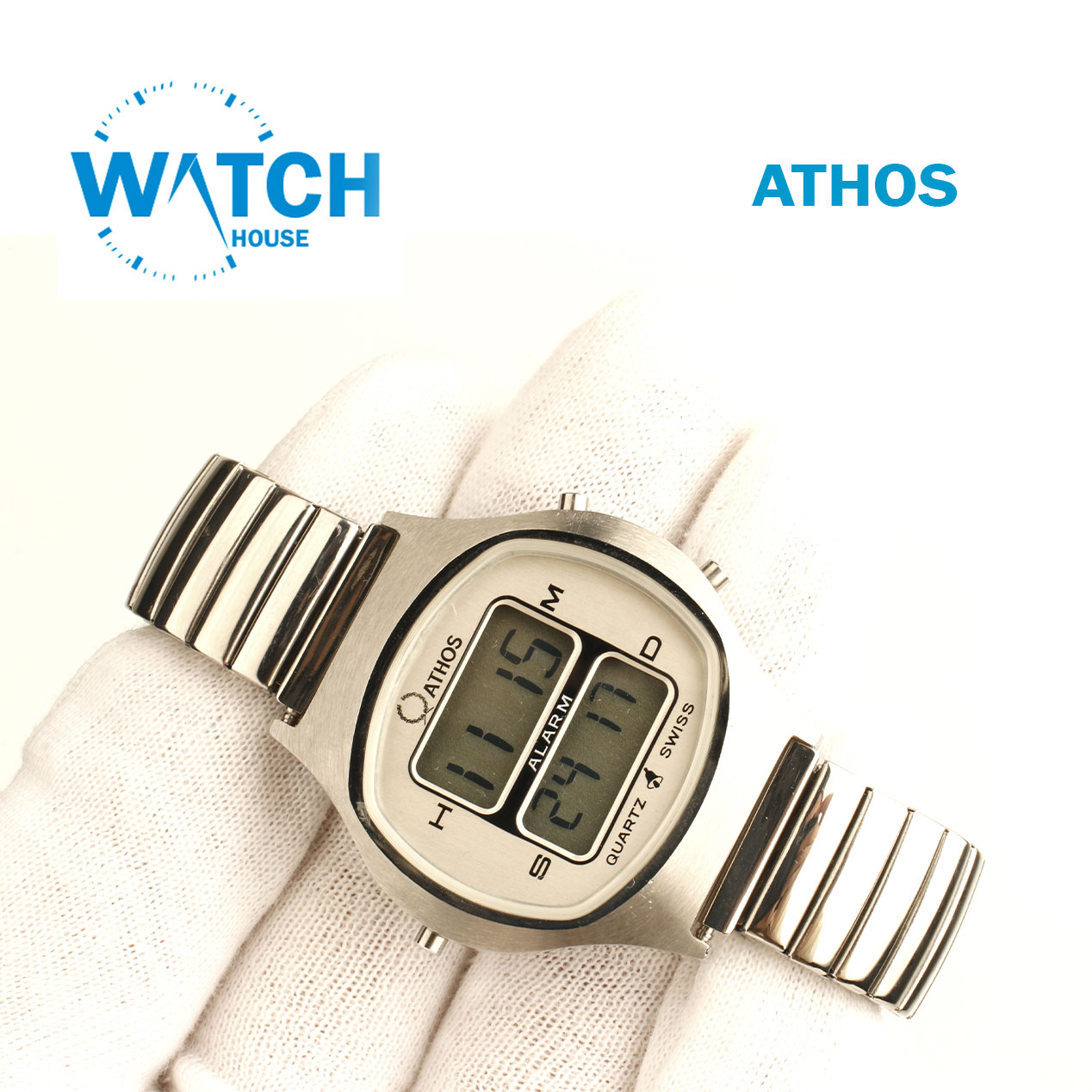 ساعة يد رقمية ATHOS كوارتز سويسرية للرجال، مزودة بشاشة LCD، مصنوعة من الفولاذ السويسري، بسوار فضي.
