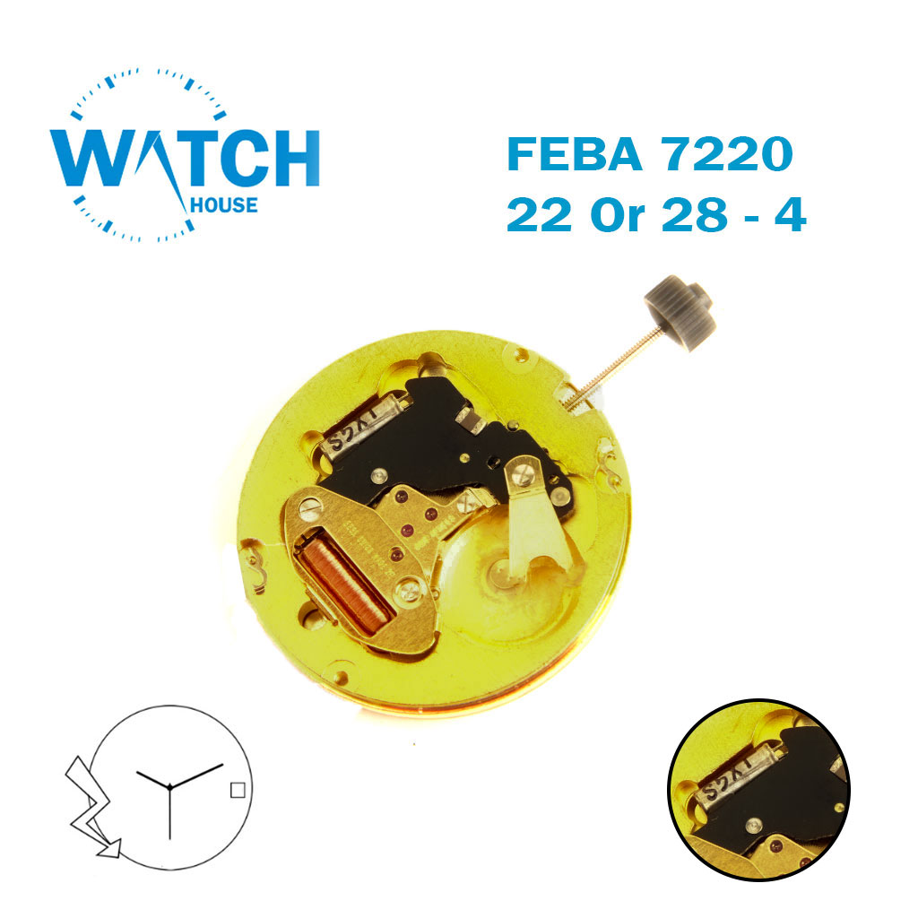 ساعة FEBA 7220 22 أو 28 – 4 سويسرية الصنع، 3 عقارب، قرص تاريخ أبيض عند 3. قرص صغير عند 6.