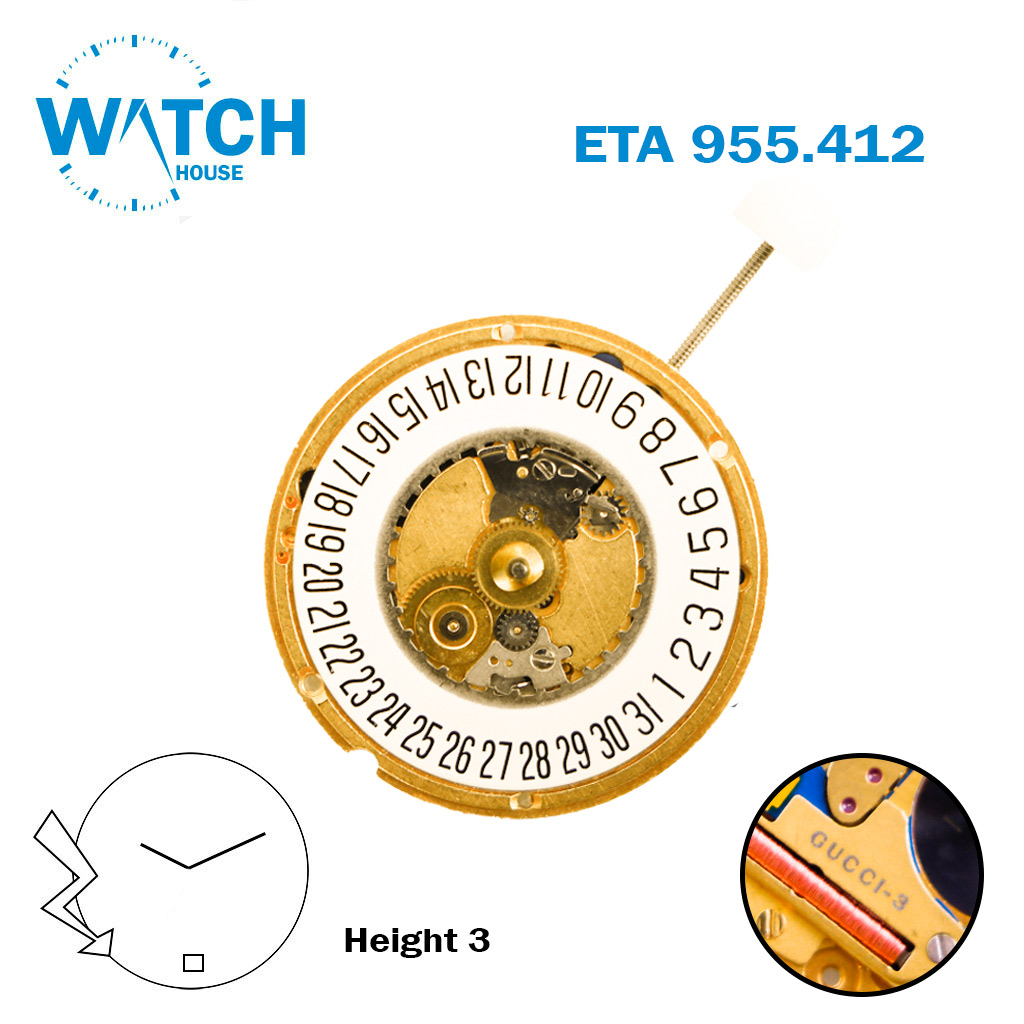 ETA 955.412 حركة كوارتز Gucci 3 سويسرية الصنع، قرص التاريخ الأبيض عند 6، العقارب، الارتفاع 3.