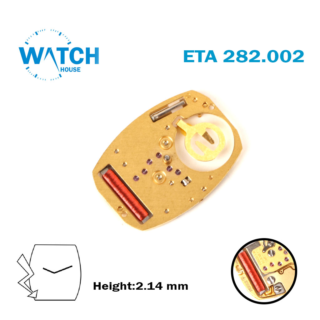 ETA 282.002 Swiss Made Watch Movement, Without Stem, 2 Hands. Gold Plated, Height : 2.14 mm