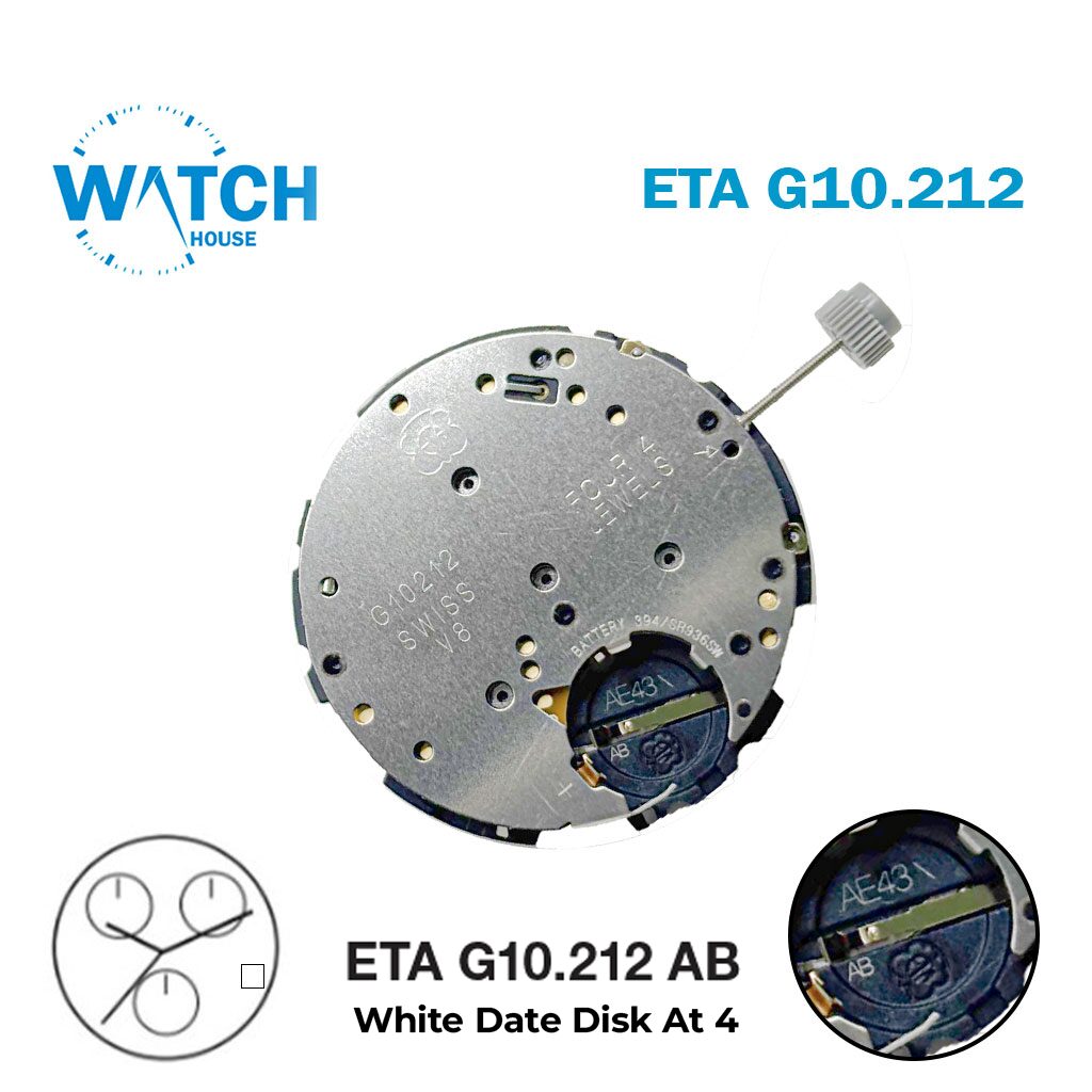 ETA G10.212 Swiss Made Quartz Movement, Chronograph Replacement MovementG10.211, White Date Disk at 4, AB
