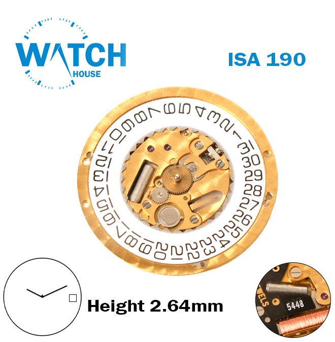 ISA 190 Swiss Made Quartz Movement, 2Hands, Without Stem, White Date Disk at 3, Decorated.