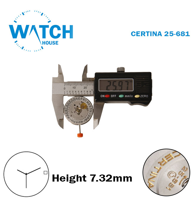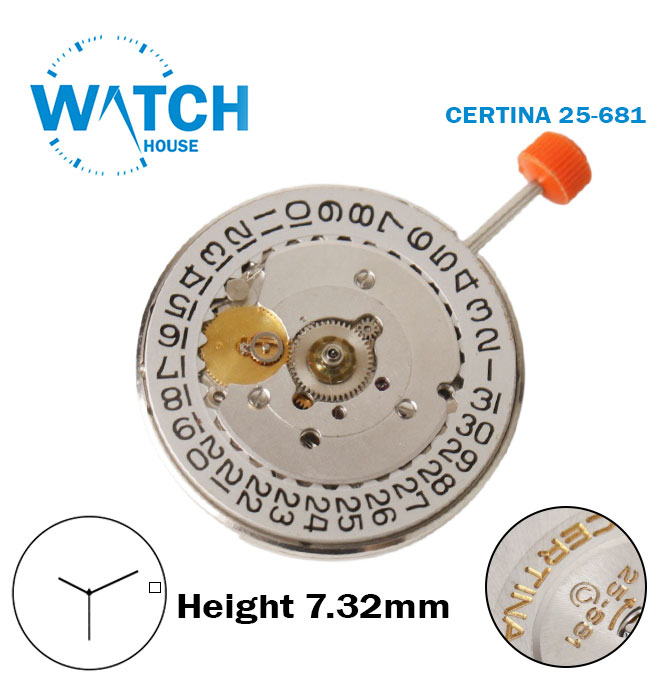 CERTINA 25-681 Swiss Made Quartz Movement, Automatic, Silver Date Disk at 3, 3 Hands, Height 7.32mm.