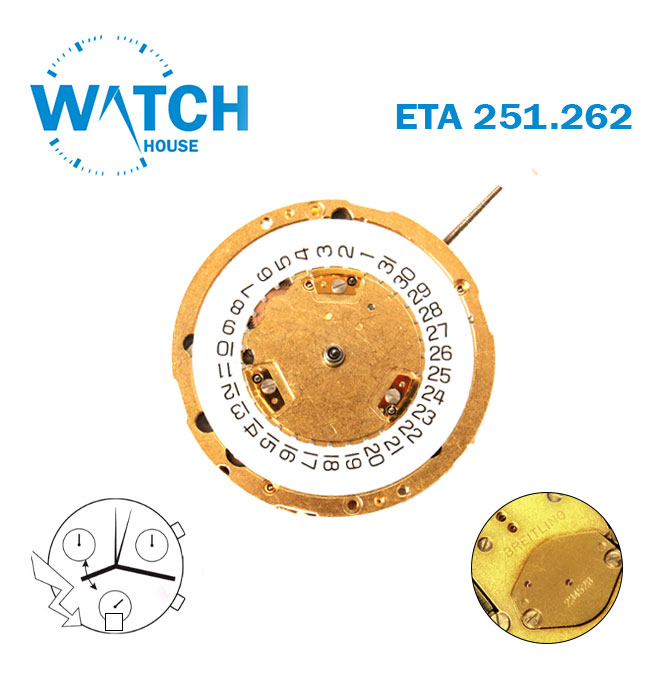 ETA 251.262 Britiling Swiss Made Quartz Movement, White Date Disk At 4, Chorograph .