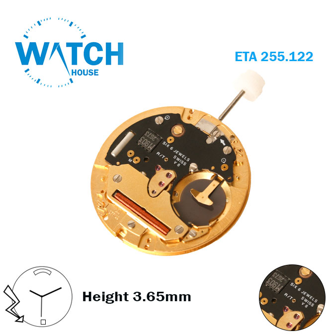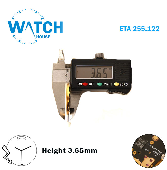 ETA 255.122 Swiss Watch Movement, White Date Disk at 6 and Day Disk at 12, 3 Hands , Height 3.65.