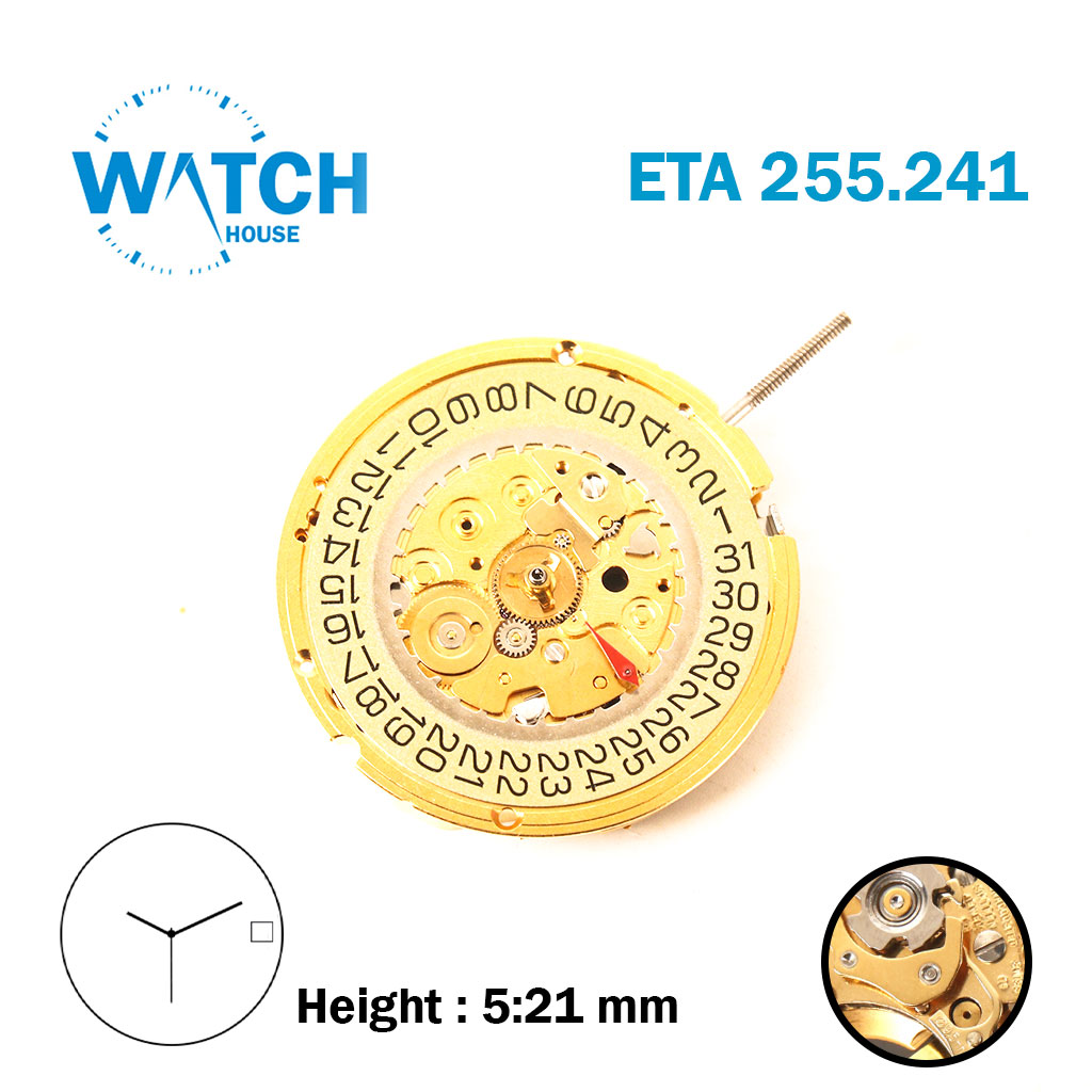 ETA 255.241 Swiss Made Watch Movement, Gold Date Disk At 3, Height 5.21 mm .
