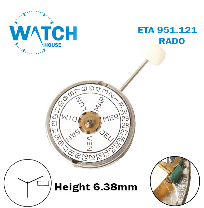 ETA 951.121 RADO Swiss Made Quartz Movement, White Day & Date Disk at 3, 3 Hands, Height 6.38mm.