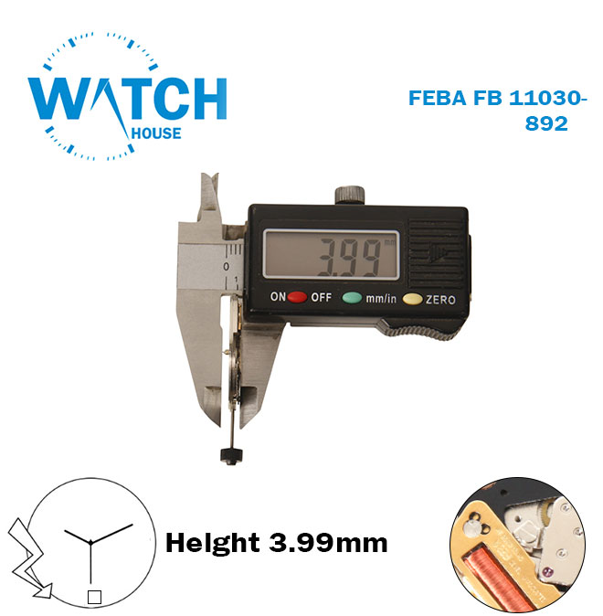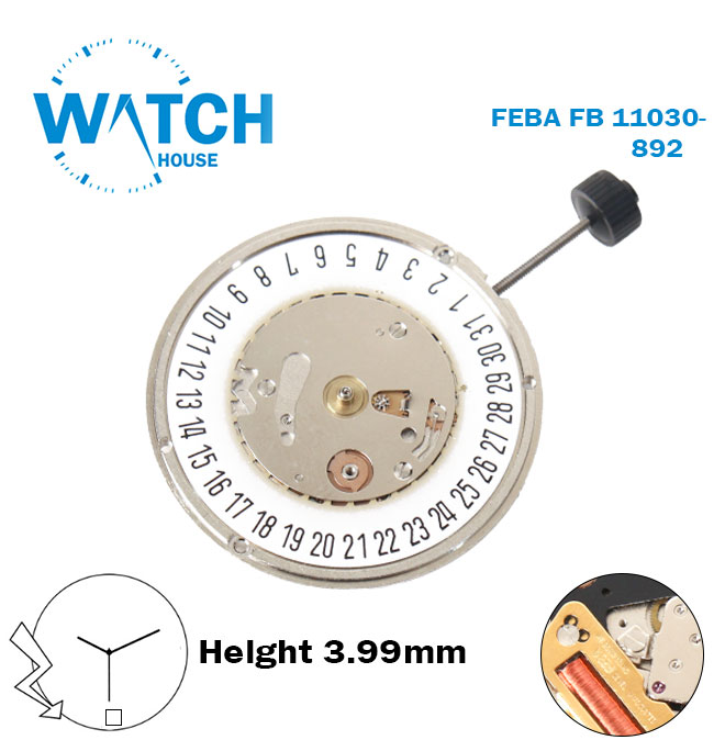 FEBA FE 11030-892 Swiss Made Watch Movement, 3 Hands, White Disk at 6, Height 3.99mm.