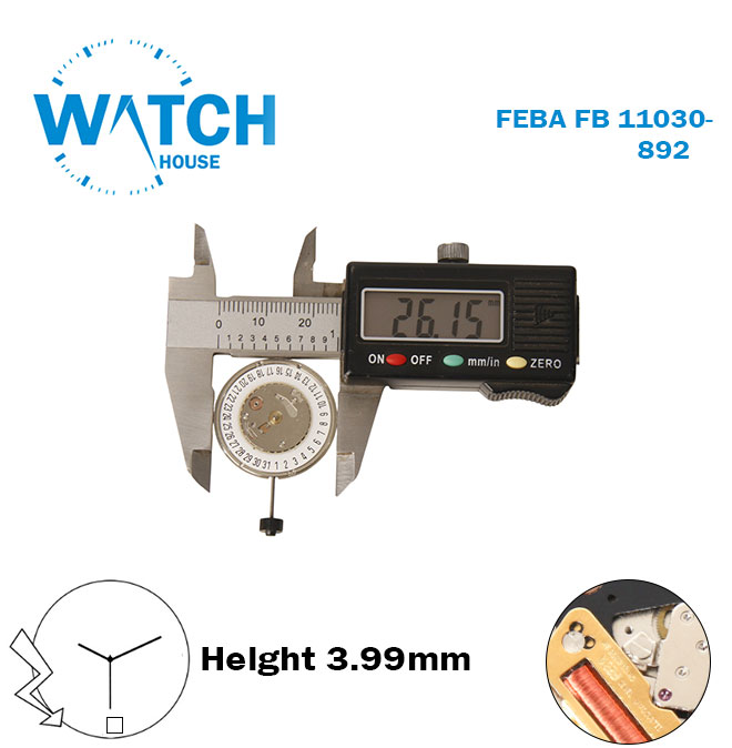 FEBA FE 11030-892 Swiss Made Watch Movement, 3 Hands, White Disk at 6, Height 3.99mm, Size 26.15.