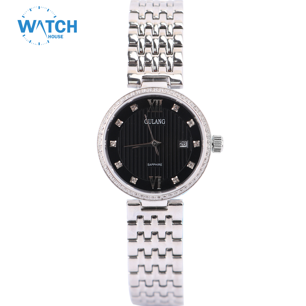 Gulang Japanese Women Watch, Stainless Steel Band, Silver Color, Black Strauss and bakes Dial, Water Resist, Quartz Movement, Date Window.