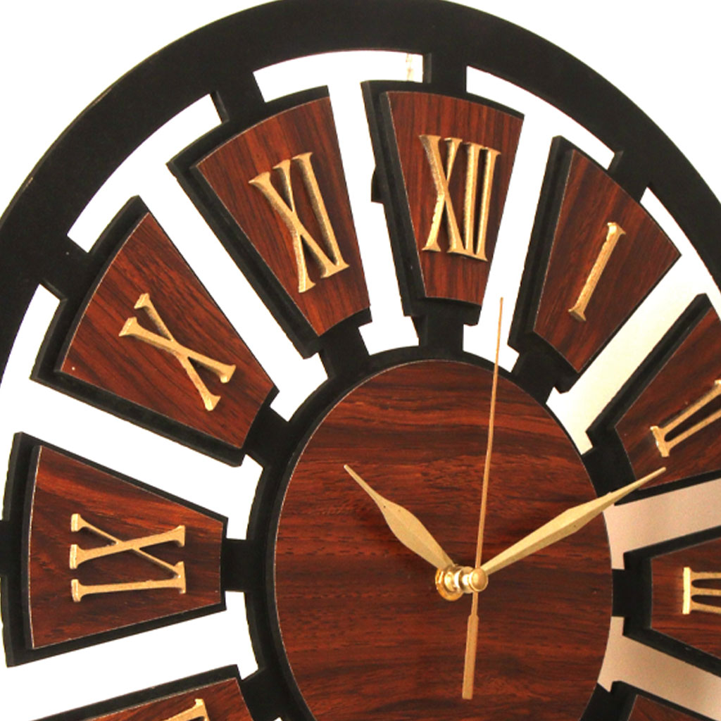 Modern Wooden Wall Clock – Dark Brown Rock-Style MDF Design with Gold Hands/ Battery Quartz, Romani’s Number .