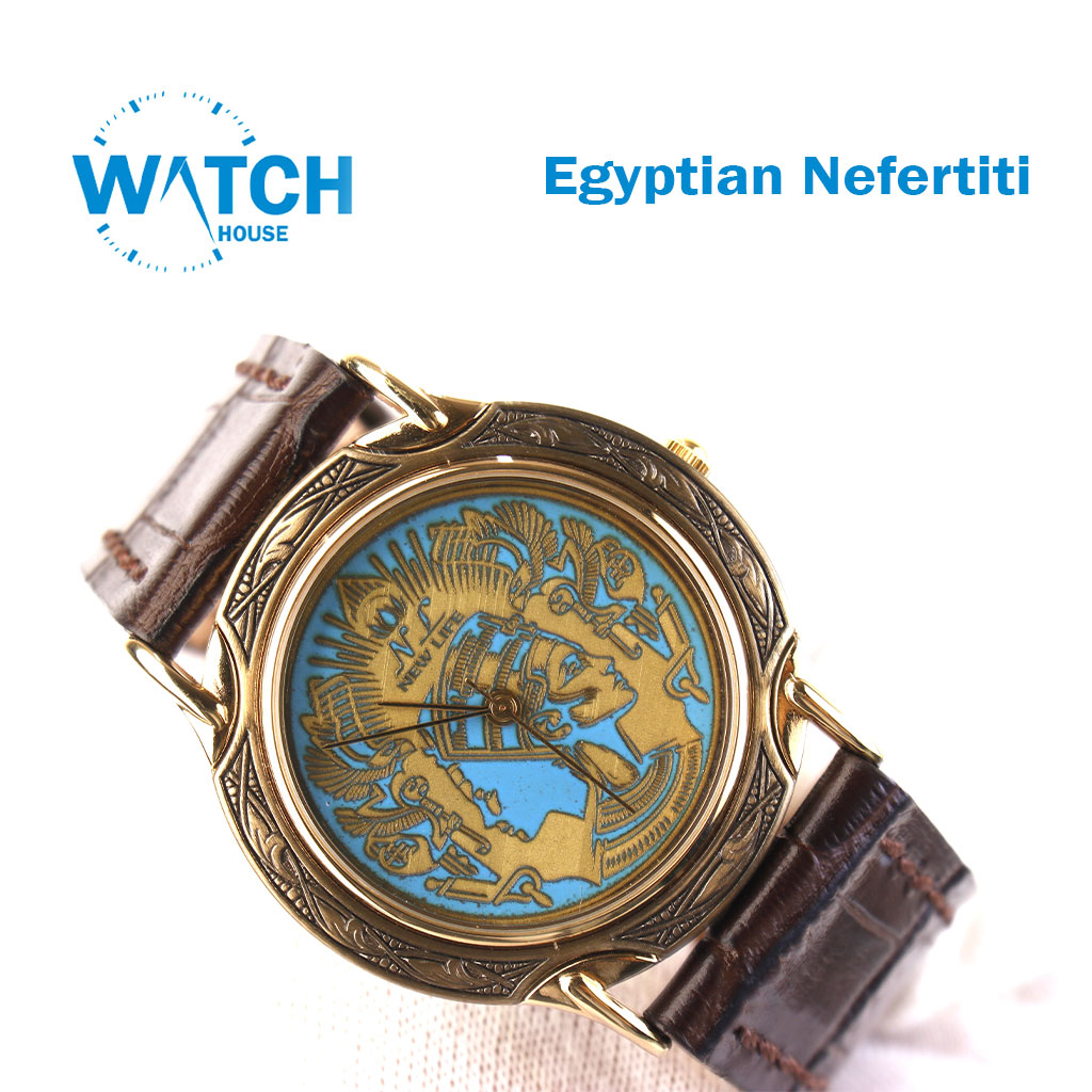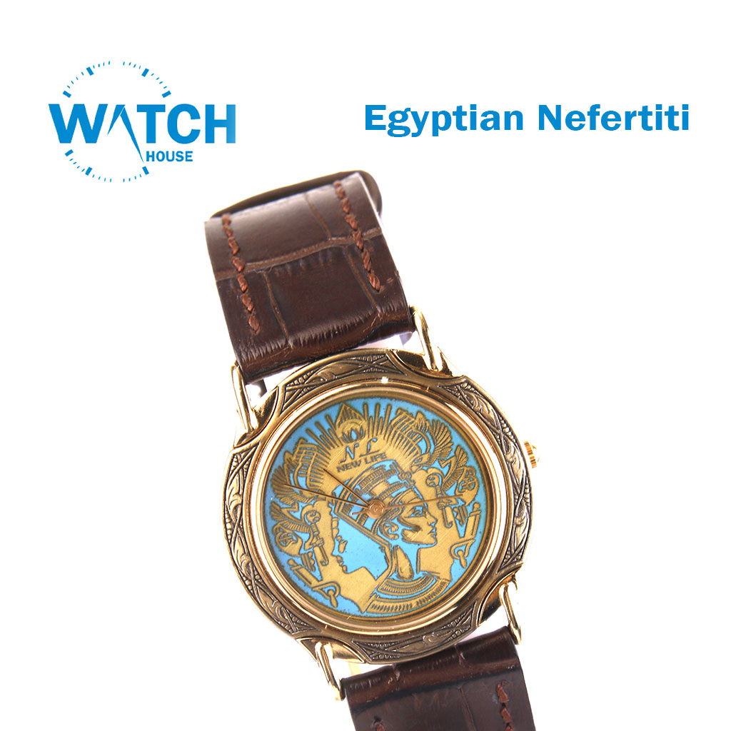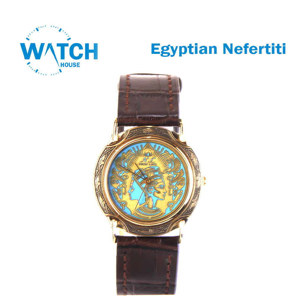New Life Egyptian Nefertiti Gold Plated Watch, Handmade 21K Gold Tone Dail | Swiss Movement | Leather Strap | Limited Edition