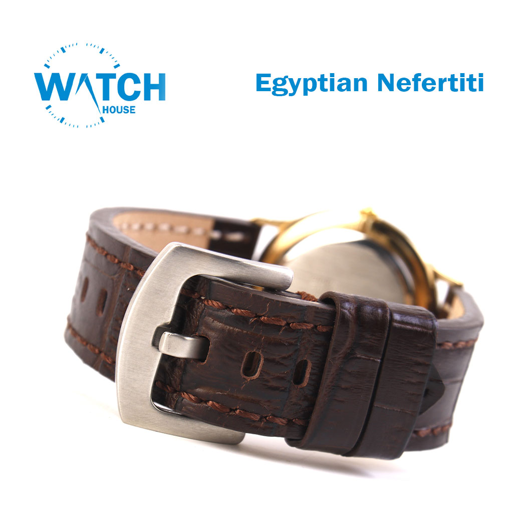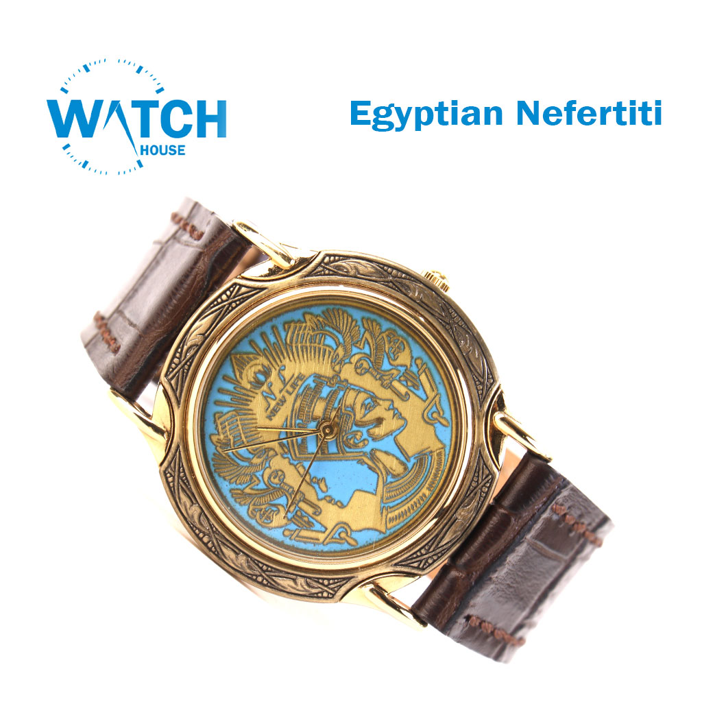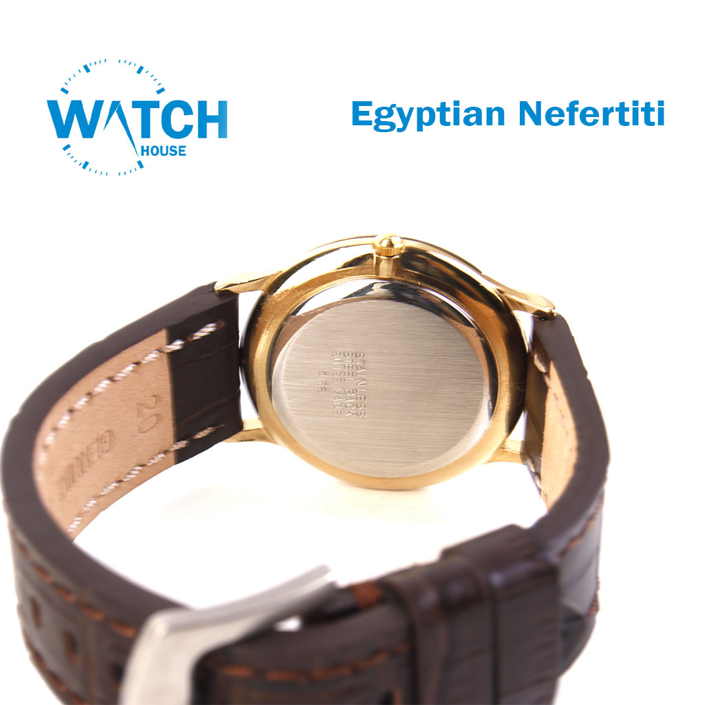 New Life Egyptian Nefertiti Gold Plated Watch, Handmade 21K Gold Tone Dail | Swiss Movement | Leather Strap | Limited Edition