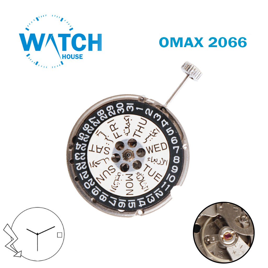 OMAX 2066 Swiss Automatic Watch Movement, 3 Hands, Black Day / Date Disk at 3.