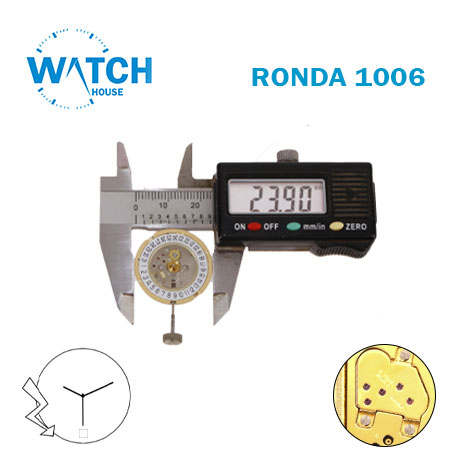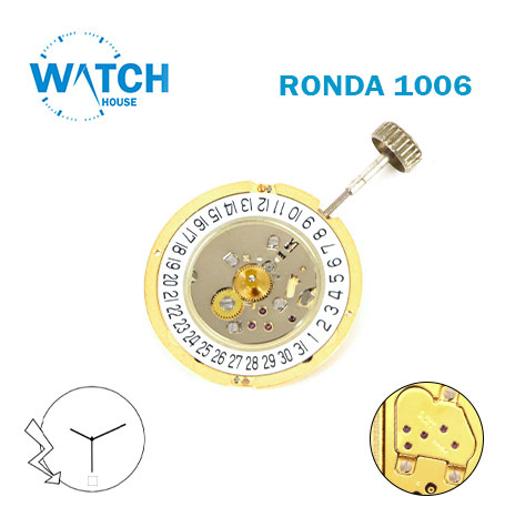 RONDA 1006 Swiss Quartz Watch Movement – White Disk At 6, 2Hands, Gold Plated – NOS-