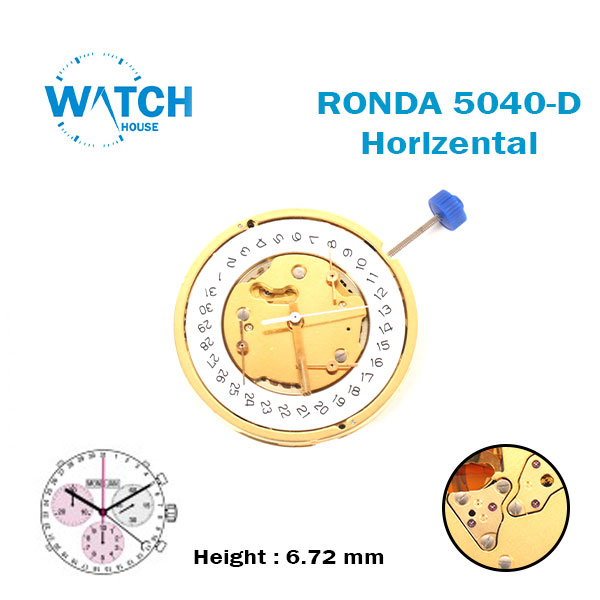 Ronda 5040.D Swiss Made Watch Movement, White Date Disk at 4, Chronograph, Horizontal Disk, Gold Plated.