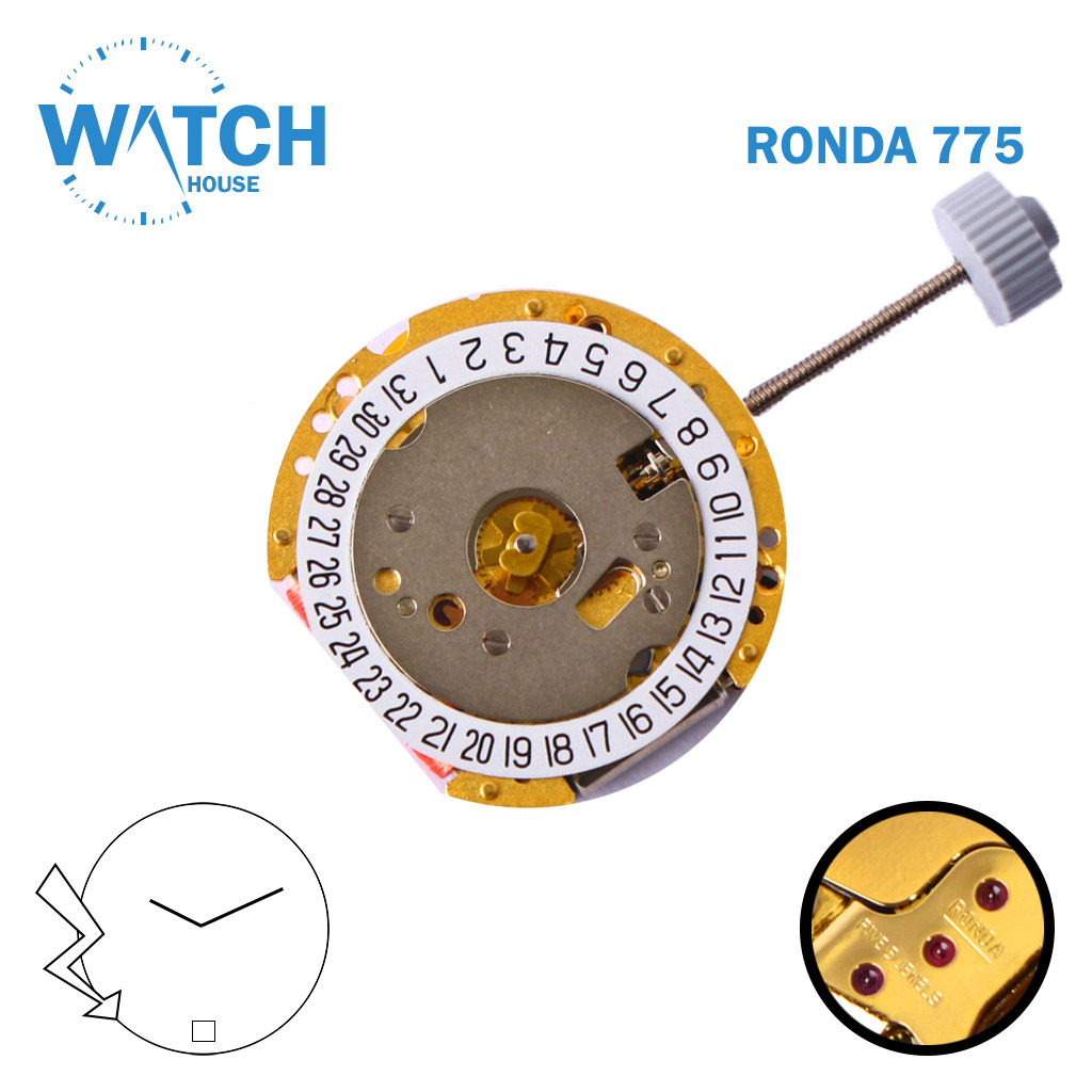 RONDA 775 Swiss Made Watch Movement, White Date Disk at 6, 2 Hands.